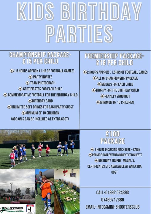 Celebrate your special day with a kick at Shooters Football! Our top-tier 3G pitches provide the perfect setting for young football enthusiasts to enjoy a football themed party. After the games, continue the festivities in our specially built party cabin, where everyone can enjoy optional food, drinks, trophies and more! Various packages available.